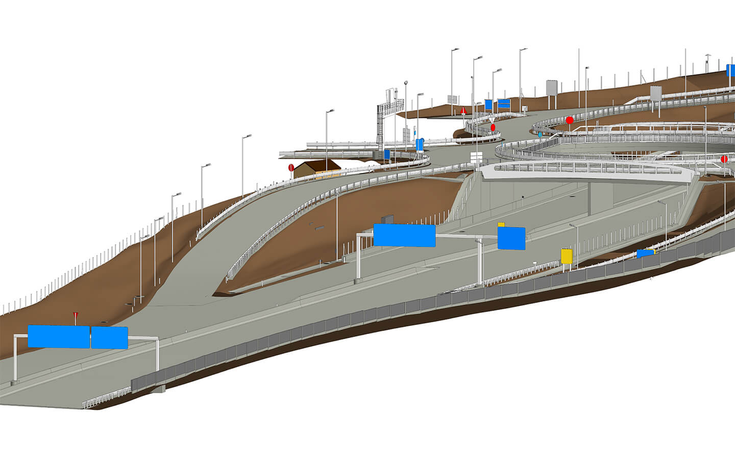 Additionally, at the client’s request, all bridge railings were modeled with a high level of detail, with posts and rails matching the point cloud as closely as possible. Additionally, all road signs were modeled to accurately reflect the real surroundings.